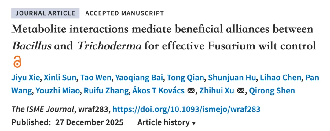 针对这一科学难题,南京农业大学沈其荣院士团队张瑞福教授课题组联合荷兰莱顿大学开展深入研究,并在国际权威期刊《The ISME Journal》上发表了题为Metabolite interactions mediate beneficial alliances between Bacillus and Trichoderma for effective Fusarium wilt control的最新成果。研究团队以贝莱斯芽孢杆菌SQR9(Bacillus velezensis)与哈茨木霉NJAU 4742(Trichoderma guizhouense)构建的互作体系为模型,综合运用全球土壤宏基因组分析、转录组测序、代谢物鉴定及基因突变验证等多种技术手段,系统揭示了跨界有益微生物如何通过代谢物介导形成稳定的联盟,共同抵御尖孢镰刀菌(Fusarium oxysporum,简称FOC)这一重要土传病原体。
