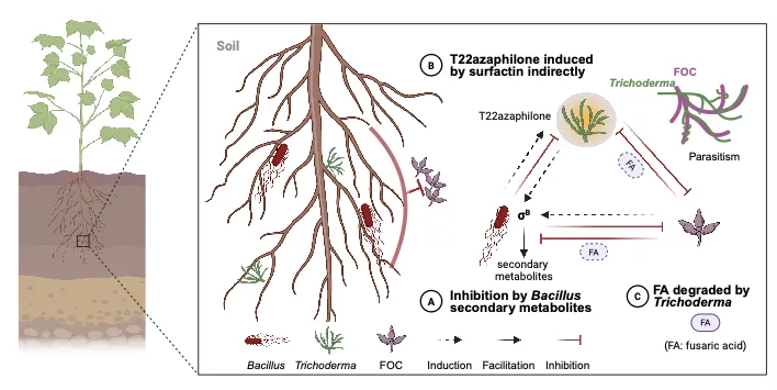 该研究从分子层面阐明了有益微生物之间复杂的“化学对话”机制:在应对外界胁迫时,芽孢杆菌通过σB调控通路迅速分泌抗菌脂肽surfactin;后者不仅直接抑制病原菌,还能诱导木霉合成一种保护性次级代谢物T22azaphilone。与此同时,病原菌释放的毒素——镰刀菌酸——虽对部分微生物具有抑制作用,却意外地为木霉创造了短暂的生态位窗口;而木霉则能高效降解该毒素,从而解除对自身及伙伴菌的抑制,最终促成芽孢杆菌、木霉与病原菌之间形成动态而稳定的三方互作平衡。