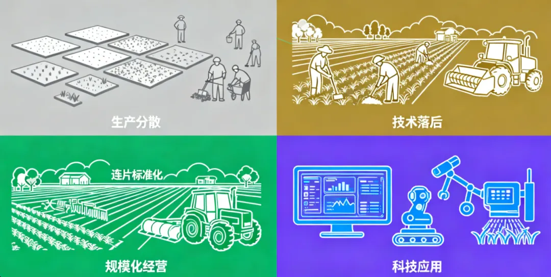 规模化经营:通过土地流转、股份合作等方式,推动小农户与合作社、龙头企业抱团发展,发展适度规模经营。