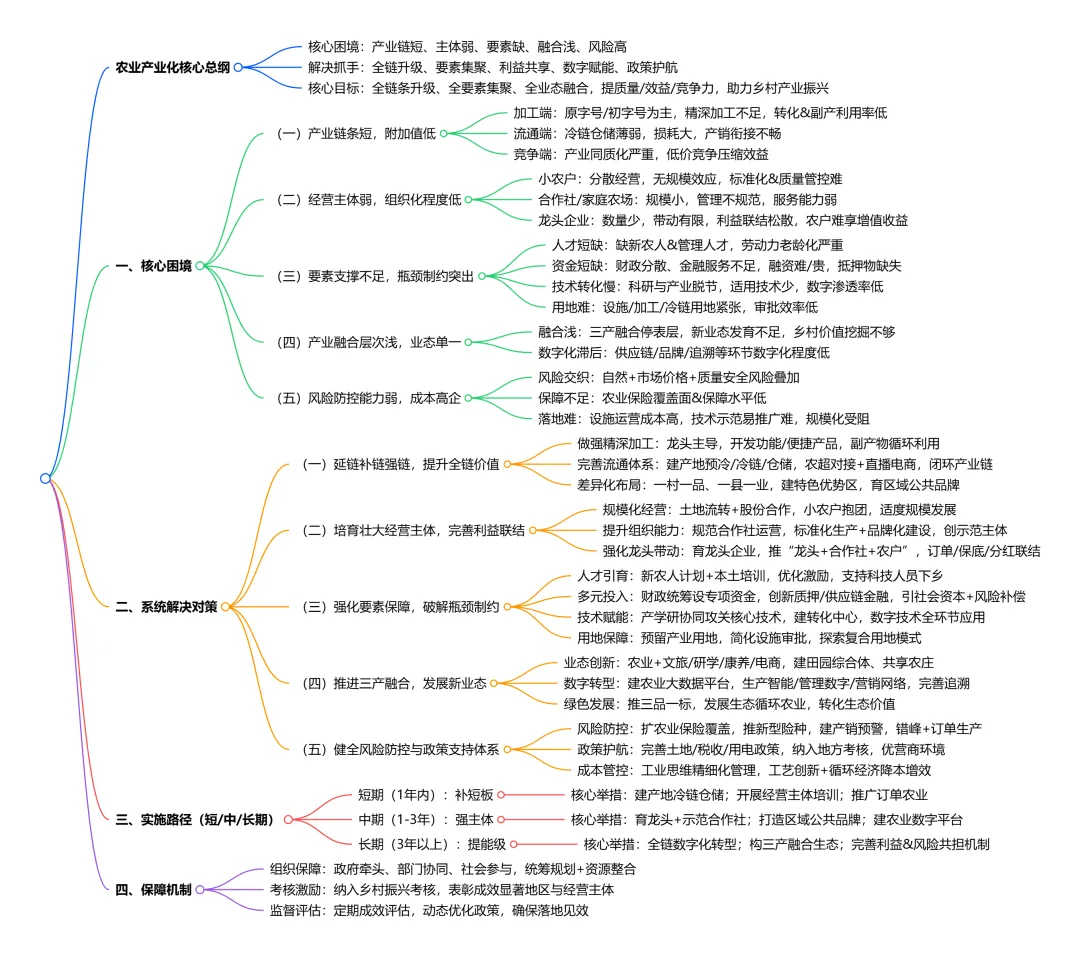 总结:农业产业化破局需坚持市场导向、科技引领、主体协同与政策保障,通过全链条升级、全要素集聚、全业态融合,实现质量、效益与竞争力的全面提升,助力乡村产业振兴。