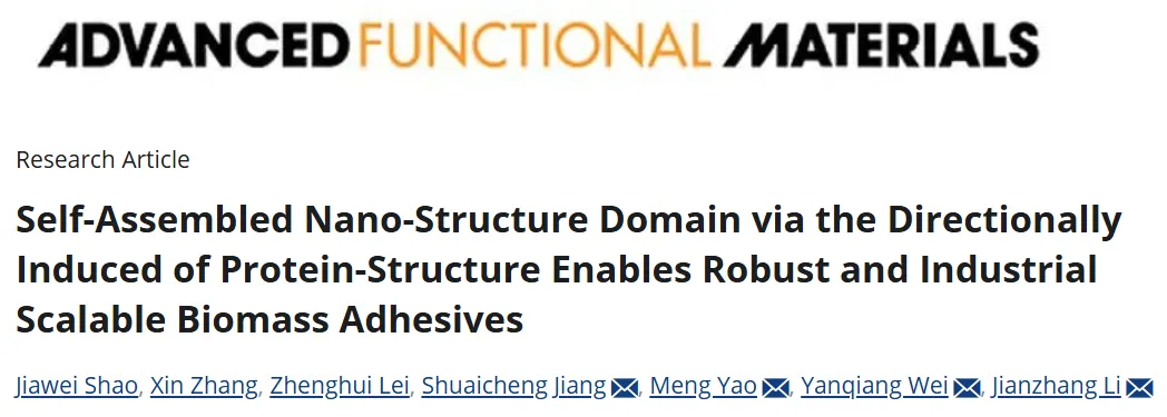 近日,北京林业大学材料学院李建章教授团队在生物质胶黏剂领域取得新进展,相关成果以“Self-Assembled Nano-Structure Domain via the Directionally Induced of Protein‐Structure Enables Robust and Industrial Scalable Biomass Adhesives”为题发表于《Advanced Functional Materials》(IF5y=19.4)。