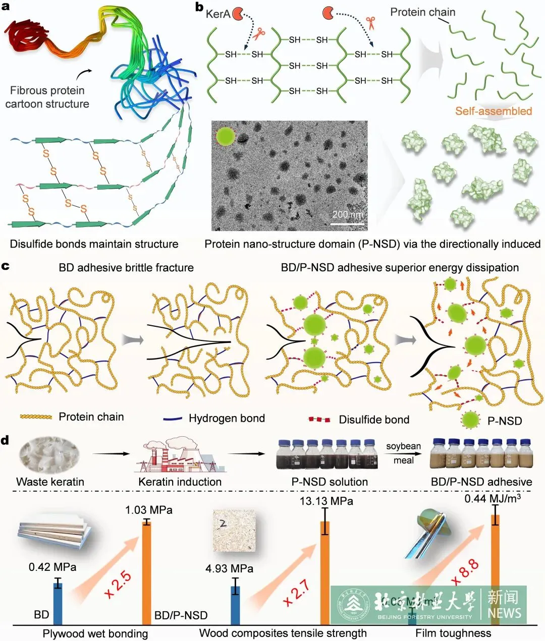 创新提出一种酶定向诱导蛋白质自组装纳米结构域的增强策略,开发出蛋白基高性能生物质胶黏剂。通过角蛋白酶对废弃羽毛角蛋白进行定向诱导,使其形成富含α-螺旋与β-转角结构的自组装纳米结构域,该结构作为球形分子弹簧嵌入大豆基胶黏剂中实现能量的高效耗散,从而同步提升胶黏剂的强度与韧性。该研究制备的蛋白胶胶合板干态胶合强度达2.99 ± 0.05 MPa,湿态胶合强度为1.03 ± 0.03 MPa;制备的薄膜韧性提升约8.8倍,同时具备优异策略普适性和工业可扩大性。该研究不仅为生物质胶黏剂的高性能化与产业化提供了新思路,也为废弃蛋白资源的高值化利用探索了新途径。