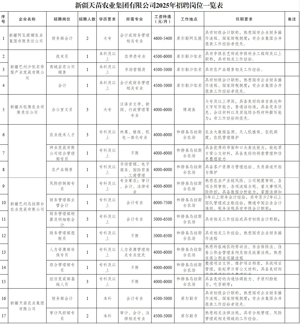 新疆天苗农业集团有限公司是巴州国资委直属国有独资企业,下辖新疆阿瓦缇娜农业集团有限责任公司、新疆清源农业发展有限公司、新疆兴牧源农业有限责任公司、新疆巴州沙依东香梨产业发展有限公司、新疆巴州乌拉斯台农业发展有限公司等8家一级子公司,拥有土地50万亩,草场77万亩。现因集团发展需要,面向社会公开招聘27人。