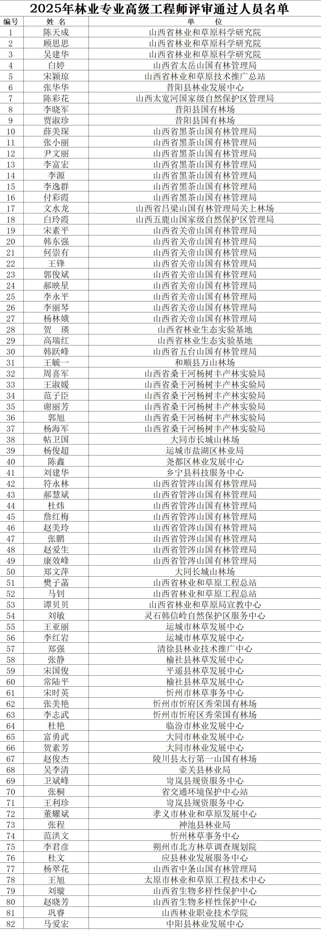 现将山西省工程系列林业专业高级工程师评审委员会2025年12月26日评审通过的82名林业专业高级工程师名单予以公示。