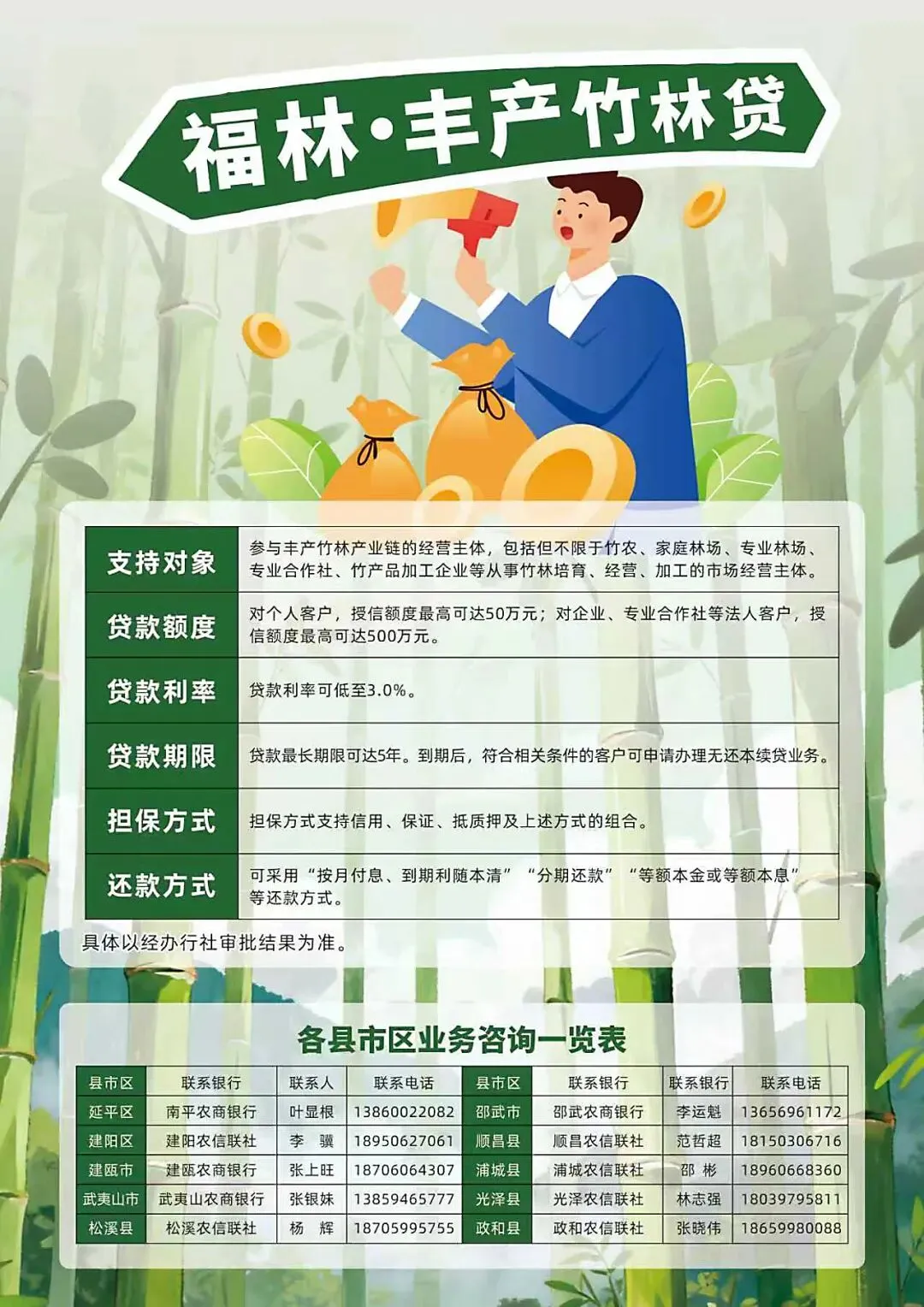 根据《中国人民银行 金融监管总局 国家林草局关于金融支持林业高质量发展的通知》精神,南平市林业局结合当地资源禀赋及产业发展实际,联合人民银行南平市分行、省联社南平办事处,共同开发专为竹产业链量身打造的“福林·丰产竹林贷”金融产品,为南平竹业高质量发展注入金融活水。