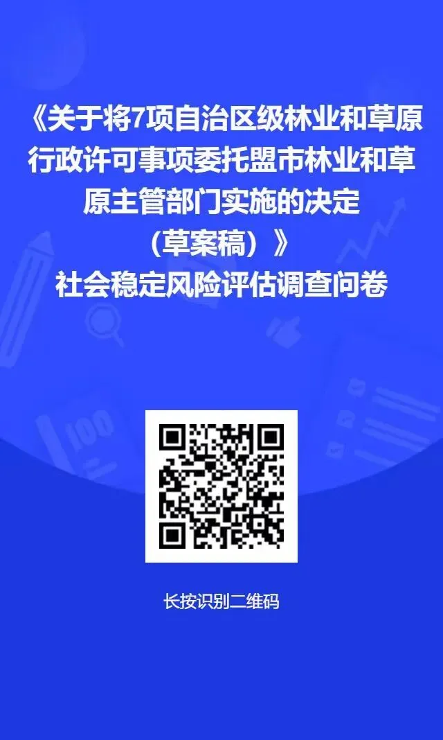自治区林草局行政许可事项委托盟市实施的风险评估调查问卷二维码已制作完成。现呼吁各类主体广泛转发、扫码填写问卷。共同为林草事业的高质量发展建言献策。