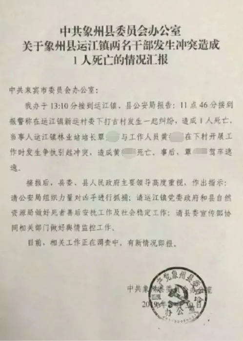而“情况汇报”的落款单位为“中共象州县委员会办公室”,时间为“2019年5月30日”。其内容显示,该办于当日下午1时10分接到运江镇、县办公室报告,称上午11时46分接到报警,运江镇新运村委下打古村发生一起纠纷,造成一人死亡。系象州县运江镇林业站的覃某与黄某在下村开展工作时发生争执引起冲突,造成黄某死亡。事后,覃某驾车逃逸。