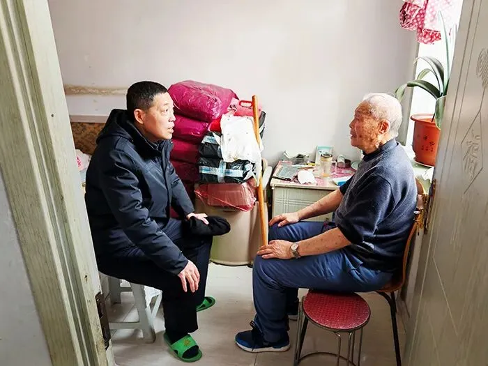 在高龄老党员康大爷家中,王毓水详细询问其身体状况和日常困难需求,嘱咐他保重身体,有困难及时向组织提出,并为他们送上慰问品。