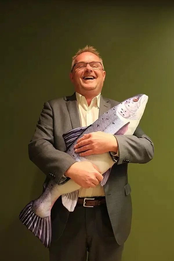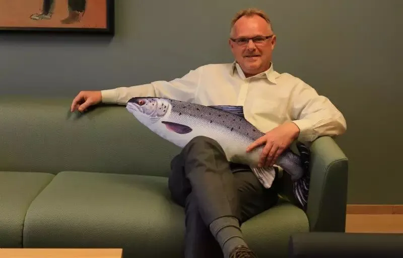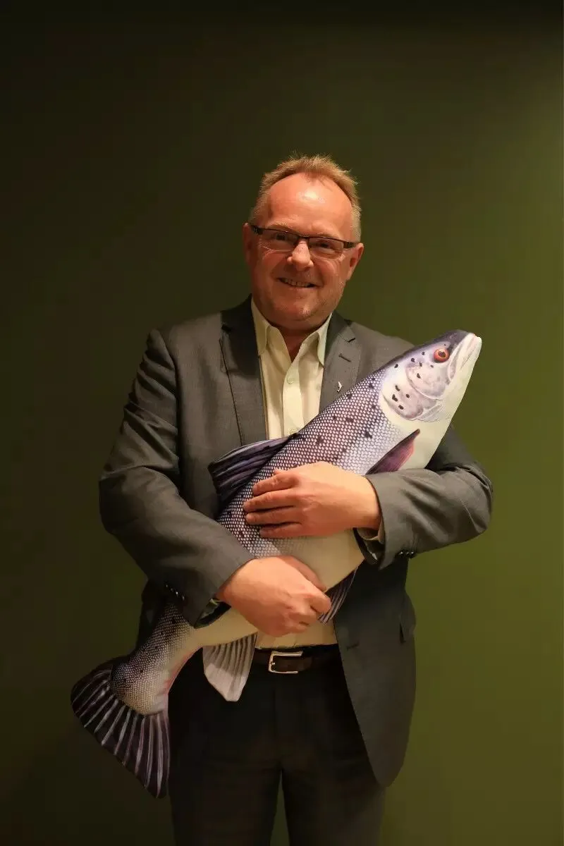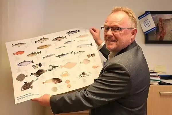 挪威渔业部长桑德博格在展示他办公桌上的鱼类图片。