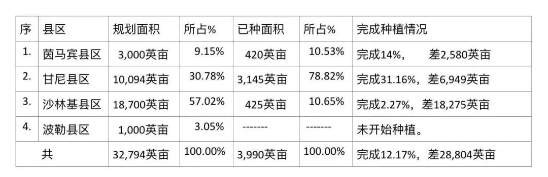 专区内的四个县区中,沙林基县区的规划种面积为最多,该县区今年冬花生规划种植的面积在1.8万英亩以上,占全专区规划种植面积的一半以上的比例。而在目前完成的种植面积方面,以甘尼县区为最多,该县区目前完成的种植面积在3千英亩以上,占全专区目前完成的种植面积的 ¾ 以上的比例。就全专区范围来说,目前完成的冬花生种植面积还很少,不到全专区规划种植面积的八分之一的比例,其中波勒县区目前都还未开始种植这冬花生呢。在茵马宾专区内种植此花生作物,每英亩约需1.5缅箩种籽,而包括此种植费、劳工费、肥料费及农药费等在内每英亩种植费用在20万缅元以上。按:茵马宾专区是实皆省内一重要的油料作物生产地区,在今年的雨作物种植季节期间,也同样规划种植雨花生33,342英亩,每英亩单位产量为45.92缅箩(见《缅华网》11月25日有关栏目的报导)。现在冬季期间又规划种植32,794英亩冬花生,可见该专区是一个重要的花生种植地区。但在广泛扩大种植此花生作物的同时,单位产量45.92缅箩与农业局规定的1英亩70缅箩的指标产量相比,还有一段距离。所以在扩大种植面积的同时,还应该提高单位产量,才有可能解决民众们的“食油难”问题呢。实皆省皎苗分县区完成雨绿豆4千多英亩的采收工作