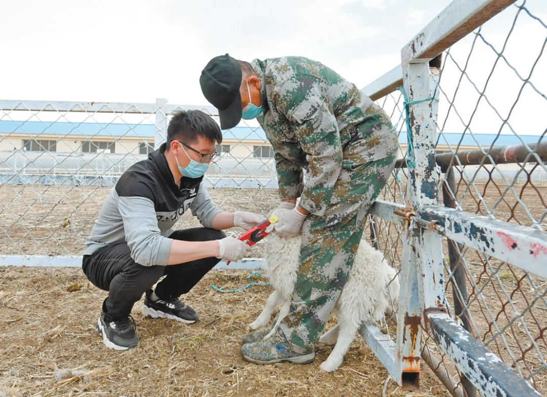 5月23日,在锡林浩特市种畜繁育中心,来自内蒙古大学的专家教授带着学生们,在对基础母羊进行抽血打耳标。