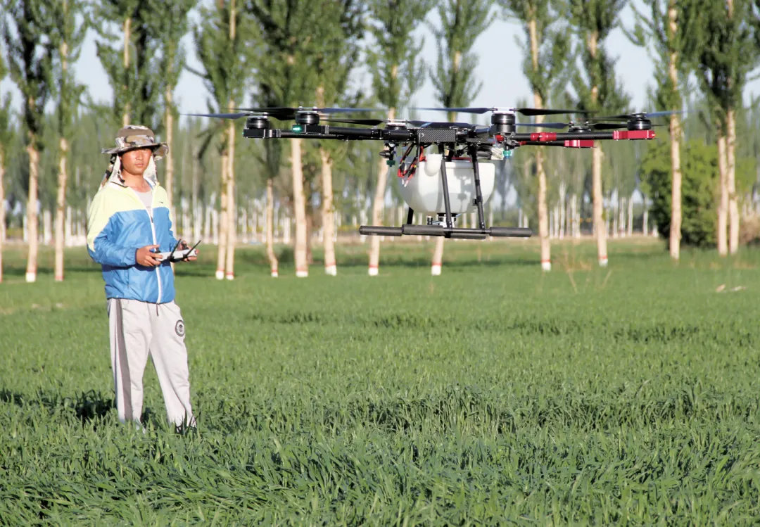 巴彦淖尔市小麦种植采取规模化种植、标准化生产、集约化经营、品牌化销售的模式,实现由传统农业向现代农业的转变。图为植保无人机作业。