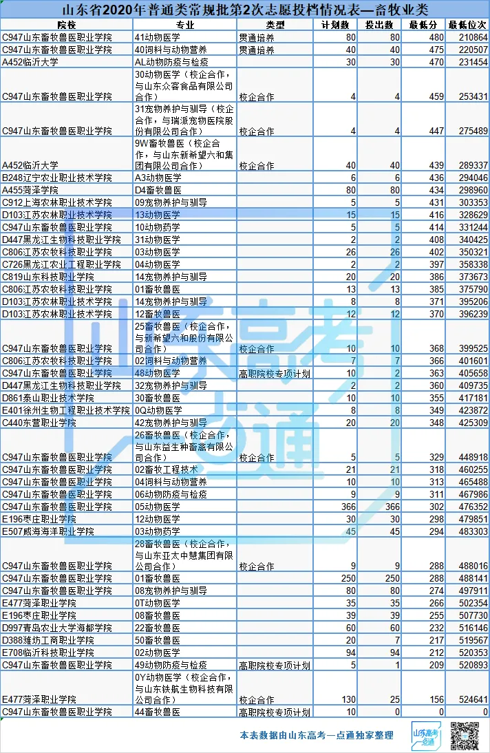 高职高专院校的专业分类是根据教育公布的《普通高等学校高等职业教育(专科)专业目录》划分为三级,第一级称为专业大类,包括农林牧渔、资源环境与安全、能源动力与材料、土木建筑、水利、装备制造、生物与化工、轻工纺织、食品药品与粮食、交通运输、电子信息、医药卫生、财经商贸、旅游、文化艺术、新闻传播、教育与体育、公安与司法、公共管理与服务,共计19个。第二级称为专业类,第三级称为专业。为帮助考生根据自己的位次和兴趣更好地规划志愿,山东高考一点通汇总了高等职业教育(专科)19大学科门类下各专业类2020年在常规批第2次志愿投档时的录取数据,供考生参考!今天我们首先来看畜牧业类。