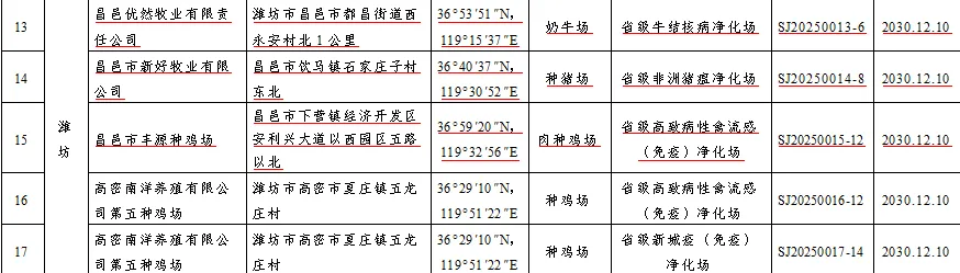 开展动物疫病净化场建设工作,是实施动物疫病区域化管理的重要抓手,也是推动畜牧业提质增效、促进产业高质量发展的关键举措。近年来,我市积极落实潍坊市相关部署要求,主动对接省、市专家团队,深入养殖企业开展常态化技术指导与服务,助力企业提升疫病防控和净化能力。截至目前,全市已有4家养殖场成功创建为省级动物疫病净化场。