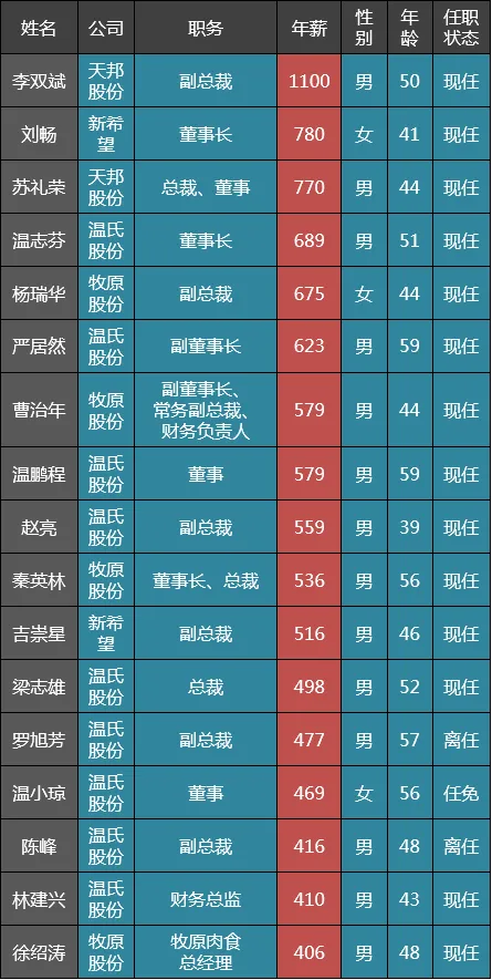 据统计,2020年,五大养猪公司中,年薪最高的是天邦股份副总裁李双斌,其年薪高达1099.78万元,为五大公司中唯一一个年薪千万的超级金领;年薪排名第二的是新希望刘畅,作为敢想敢干、雷厉风行的创二代,刘畅拿780万的年薪无可厚非;年薪排名第三的苏礼荣,仍出自天邦股份,年薪达770万元,作为天邦老将,2001年5月就已经加入公司,在各省历练逐步升到公司总裁、董事的高位;年薪排名第四的是温氏股份董事长温志芬,作为温氏股份董事长年薪为689万;年薪排名第五的是牧原股份副总裁杨瑞华,其2020年年薪高达675万元;年薪排名第六的是温氏股份老将严居然,目前职位是副董事长,年薪623万;年薪排名第七的是牧原股份副董事长、常务副总经理、财务负责人曹治年。曹治年也是五大公司中年薪最高的财爷,2020年领取了579万元年薪。