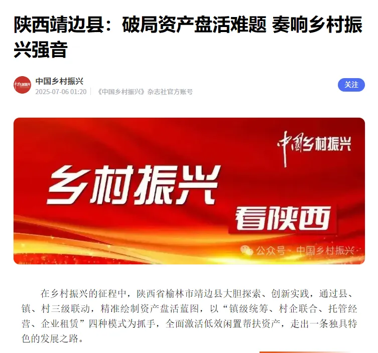 《陕西靖边县:破局资产盘活难题 奏响乡村振兴强音》刊登《中国乡村振兴》杂志。