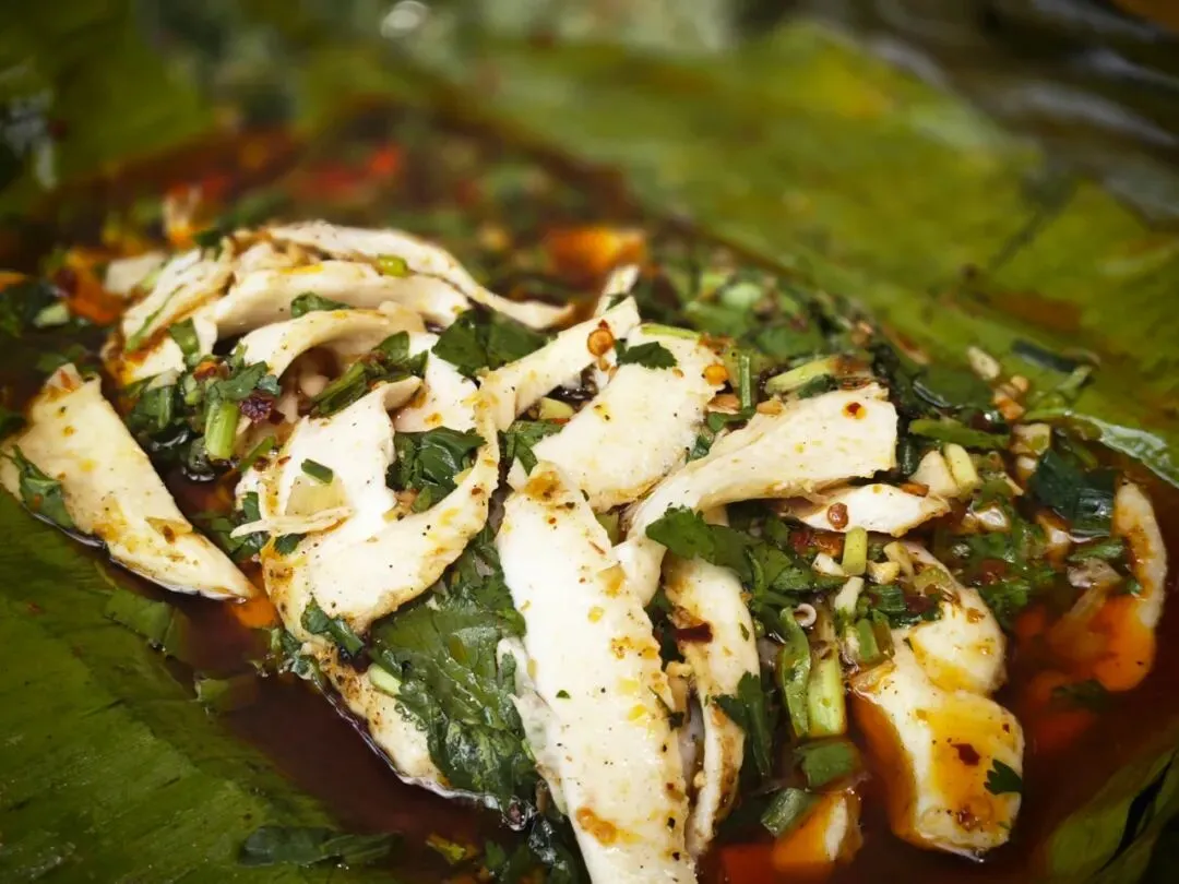 包烧是傣味的一大特色。黄喉脆嫩,被丰富的香料整个儿包裹起来,外面围上绿油油的芭蕉叶子,只消片刻,美味尽出。