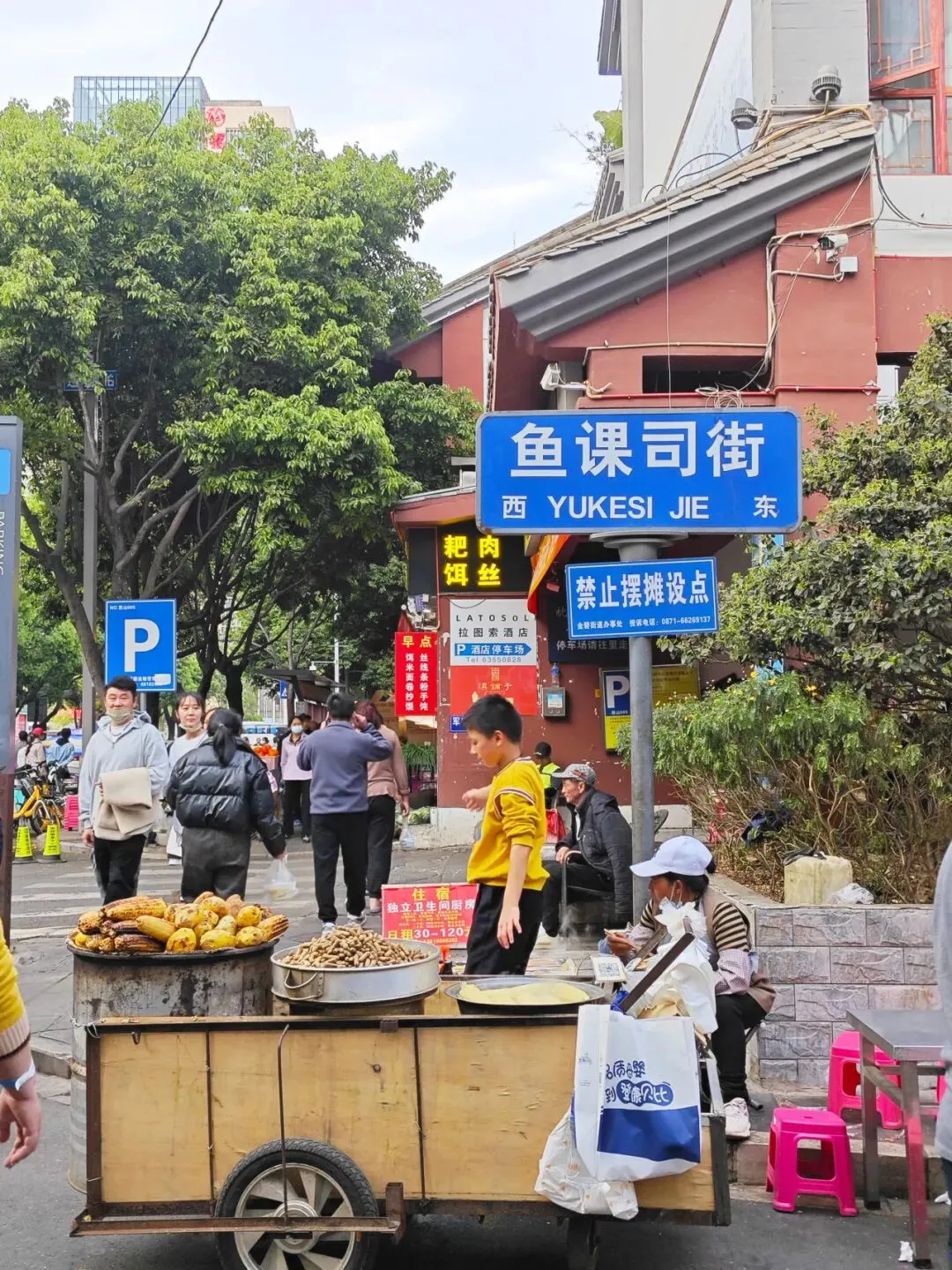 卖炒饭的,炸洋芋的,榨橙汁的,烤鸡翅的,立刻点燃起鱼课司街的烟火气。