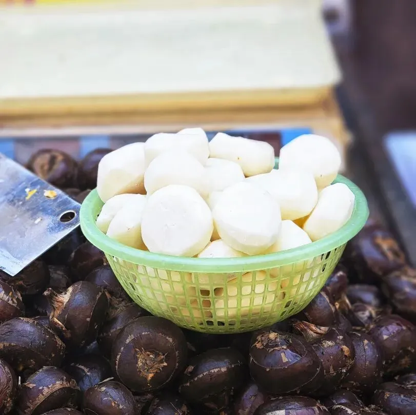 花生蒸得松软,只一点点咸盐味儿,就是个健康的好零嘴儿。一手捏荸荠,一手执菜刀,只管边转边削,薄皮嗖嗖往下落,白生生的荸荠就装了一筐。包谷、洋芋、红薯,烤得黄澄澄,带着点儿虎皮焦边,香味儿直往鼻子里钻。