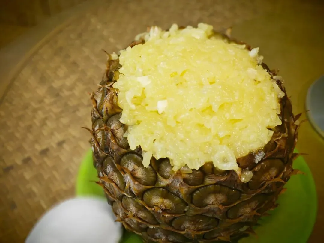 去吃傣味,必点的是菠萝饭。糯米淡黄,与菠萝的香甜完美交融,以菠萝为盛具,好吃又好看。