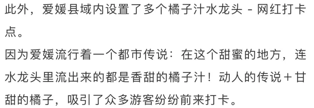 日本通过小小的橘子,以极低的成本将爱媛大名营销到全球,又通过爱媛旅游,促进了爱媛柑橘的消费。