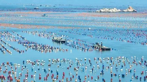 养殖船在广东省汕头市南澳岛的海面上进行生蚝养殖投放。陈志强 摄(影像中国)