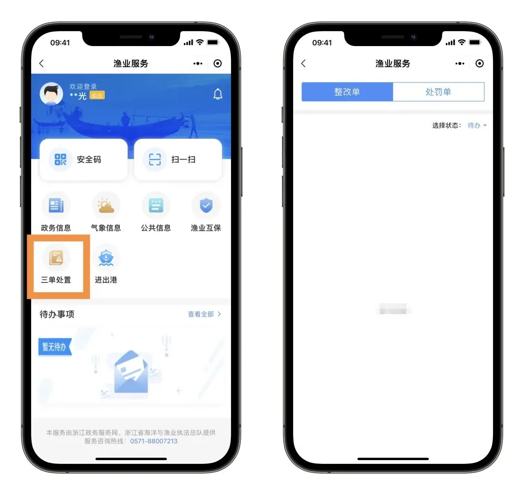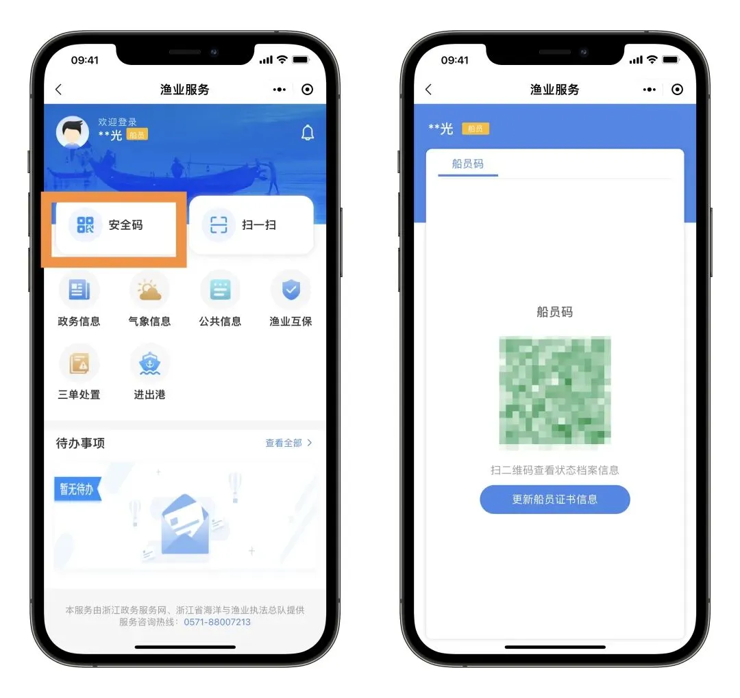 目前,“渔业服务”上线了【安全码】、【政务信息】、【气象信息】、【公共信息】、【渔业互保】、【三单处置】、【进出港】7个功能模块,该服务通过与“浙渔安”、统一执法办案平台、气象、互保等数据共享,多跨协同,实现常用业务掌上可办,为渔民掌上办事提供便利。