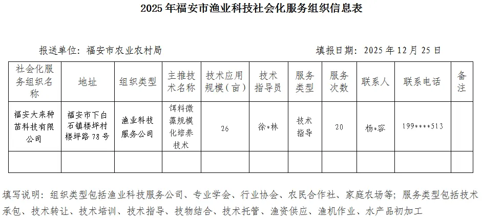 根据《福建省财政厅 福建省海洋与渔业局关于提前下达2025年中央农业经营主体能力提升资金的通知》(闽财农指〔2024〕117号)、《福建省财政厅 福建省海洋与渔业局关于下达2025年中央农业经营主体能力提升资金的通知》(闽财农指〔2025〕17号)以及2025年福安市基层水产技术推广体系改革与建设项目实施方案等文件要求,经遴选,拟确认福安大来种苗科技有限公司为2025年渔业科技社会化服务组织。现将拟确认单位予以公示,公示期间为2025年12月26日至2026年1月4日公示期间欢迎干部职工、群众以来电、未信、来访的形式反映情况,发表看法和意见。