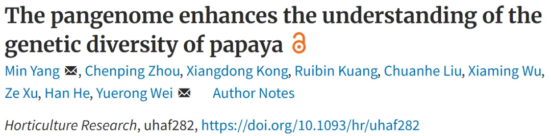 2026年第2期,Horticulture Research 上线了(Advance Access)广东省农业科学院果树研究所岭南特色果树研究团队题为 The pangenome enhances the understanding of the genetic diversity of papaya 的研究论文。