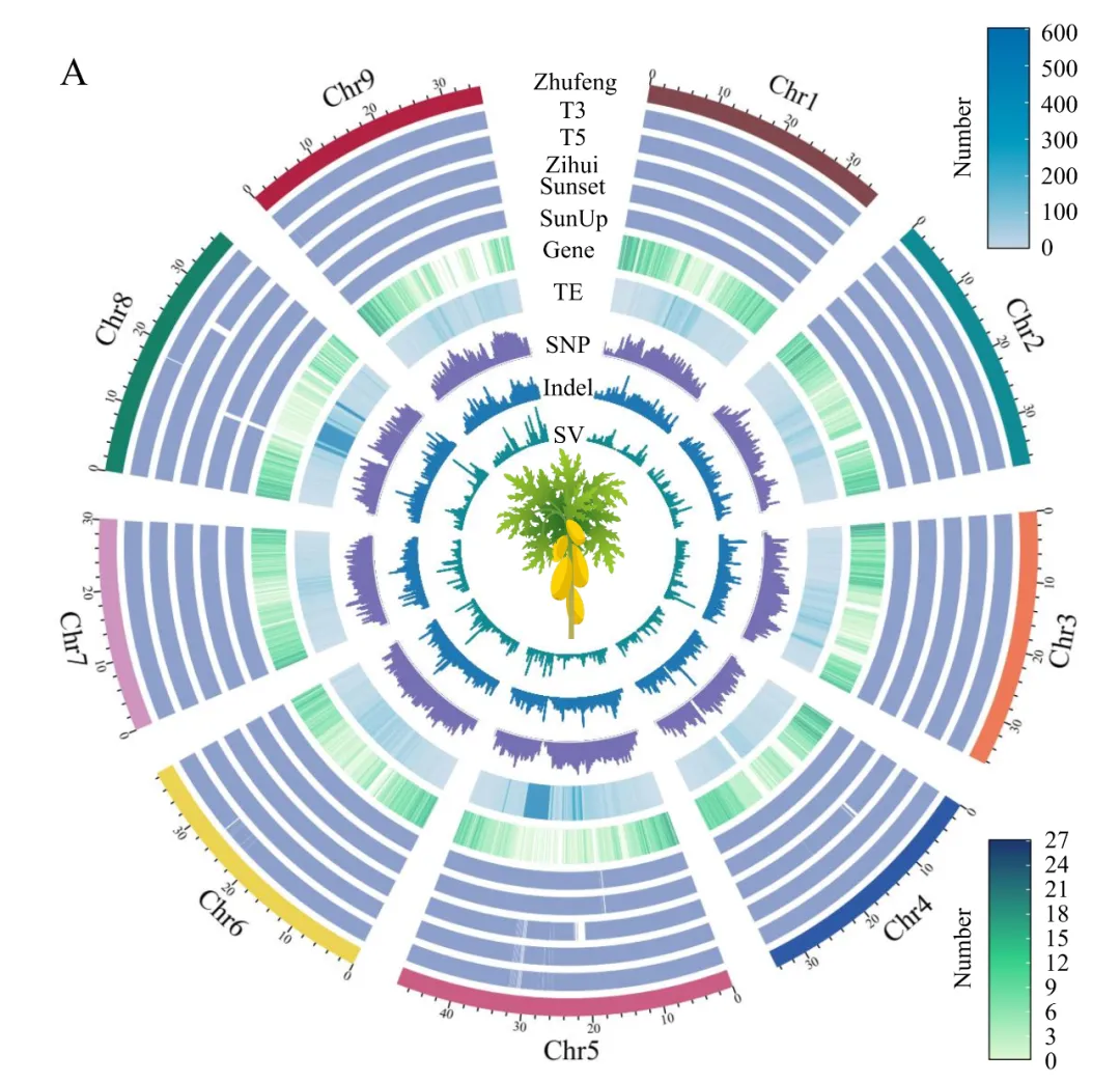 此前番木瓜研究主要依赖转基因品种SunUp及其亲本Sunset。本研究增加了三个具有明显表型差异(如果实形状、颜色、产量等)品种(Zhufeng,T3,T5)的高质量基因组以及重新组装的紫晖品种基因组。本研究不仅为番木瓜遗传育种提供了高质量的基因组资源与变异图谱,也为解析复杂农艺性状、挖掘抗病抗逆基因、加速分子标记辅助育种奠定了坚实基础。