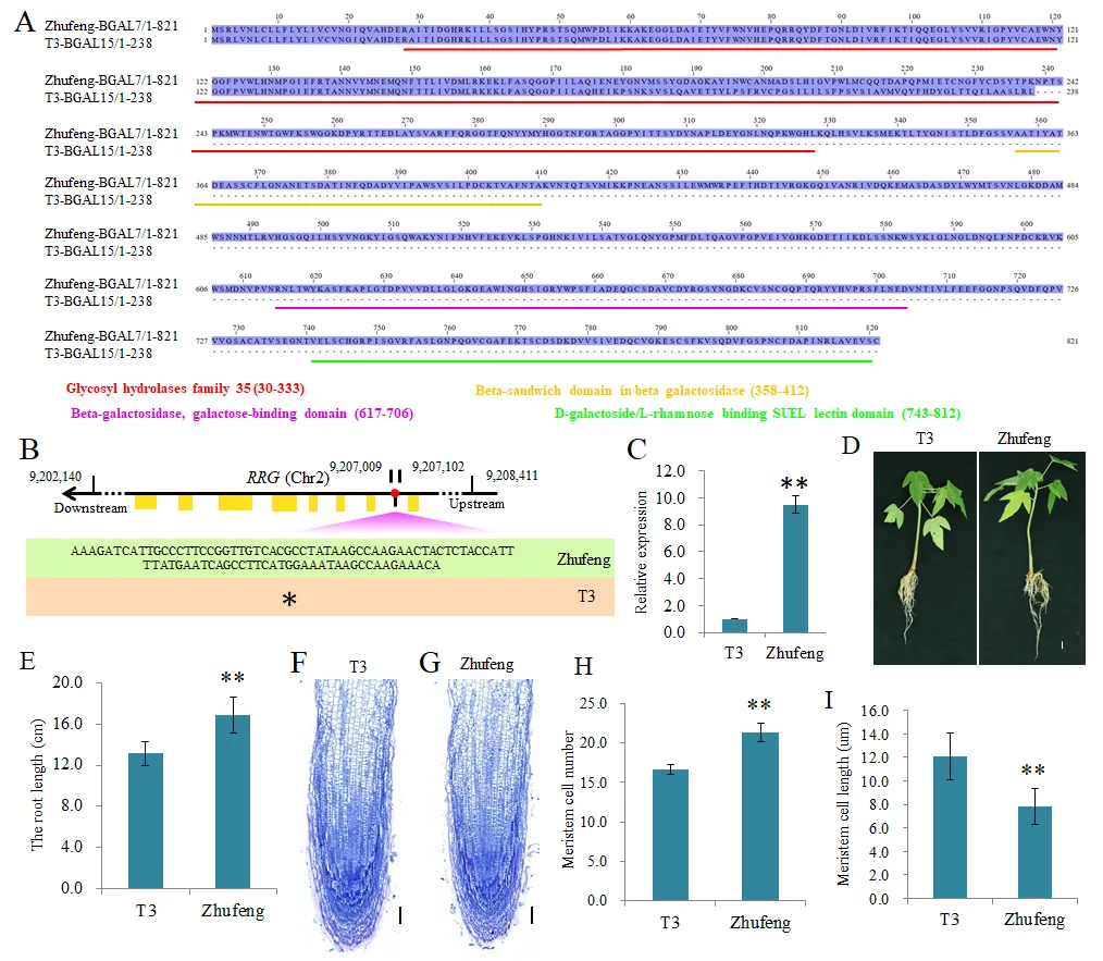 基于泛基因组数据分析,发现T3品种中RRG基因内含子区94 bp的缺失变异,导致其表达量显著降低。进一步的表型及细胞学观察统计分析,确证了该基因可通过促进根分生组织细胞增殖、抑制细胞伸长,调控番木瓜根长。该发现首次在番木瓜中揭示了RRG基因调控根系发育的分子机制。