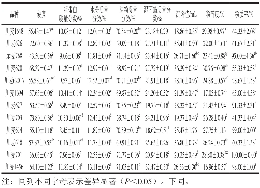 如表1所示,籽粒硬度方面,川麦626(72.60±0.36)和川麦703(73.80±0.36)显著高于其他品种(P<0.05),川麦701具有最低的硬度(36.03±0.45)。川麦1456的粗蛋白((11.82±0.14)%)、水分((13.11±0.03)%)和湿面筋((32.47±0.30)%)质量分数显著高于其他品种(P<0.05)。淀粉质量分数最高的品种是川麦701((71.77±0.06)%)。沉降值、粉碎度和粉质率最高的品种分别为川麦618((36.80±0.73)mL)、川麦627((31.43±0.94)%)和川麦701(100.00%)。这些结果证实了所选小麦品种间存在品质差异,为研究不同品质特性对大曲品质的影响提供了理想的材料基础。尤其是硬度、蛋白质含量和湿面筋含量的显著变异,为进一步分析这些关键参数与制曲品质的关联性提供了有利条件。