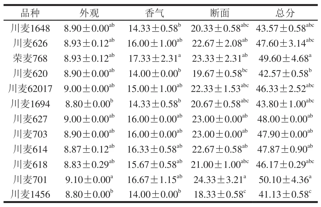 值得注意的是,大曲感官品质表现最佳的川麦701和荣麦768均具有较低的硬度(分别为36.03±0.45和43.50±0.56)和中等偏低的蛋白质量分数(分别为(7.96±0.06)%和(9.06±0.08)%),同时具有较高的粉质率(分别为100.00%和95.00%)。邹凤亮等研究表明,软质率为75%~85%的小麦品种制曲效果最佳。软质小麦因其细胞结构较疏松和支链淀粉含量较高,更易被大曲微生物群落利用,有利于微生物的生长和提高其酶系活性。