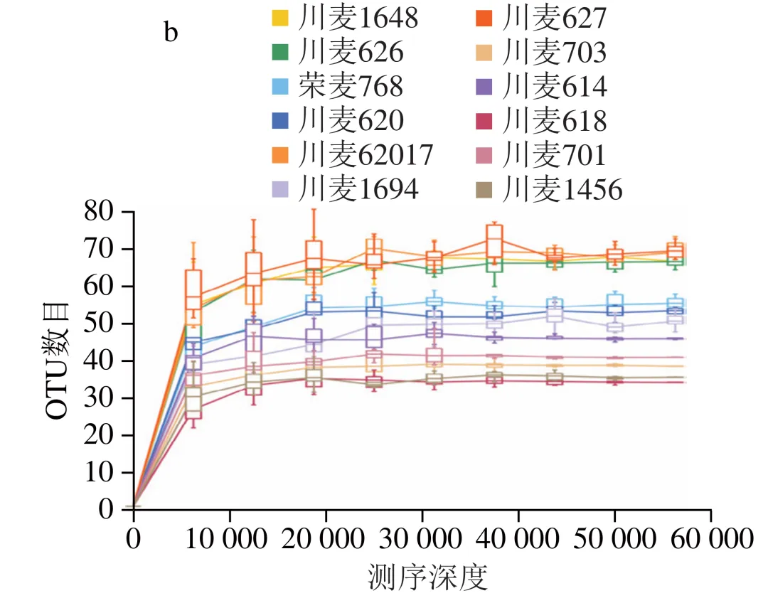 大曲样品的微生物多样性分析首先通过构建稀释曲线评估测序深度的充分性。随着测序深度的增加,曲线逐渐趋于平稳(图2),Good’s coverage指数均高于99.5%,表明样本中大部分物种已被捕获,且测序深度足够。进一步对各大曲样品中的ASVs进行分析,大曲中细菌ASVs数量为191~629,真菌ASVs数量为80~165。Chao1指数反映微生物的物种丰富度,Shannon指数反映微生物物种多样性,所有大曲细菌的Chao1指数(138.86~308.66)和Shannon指数(2.60~4.17)明显比真菌高(Chao1指数:34.06~69.11;Shannon指数:1.21~2.29),表明大曲中细菌比真菌物种丰富且多样性高。此外,细菌Chao1指数和Shannon指数最高的品种为川麦703(308.66)和川麦62017(4.17),而真菌则为川麦62017(69.11)和川麦1648(2.29)。