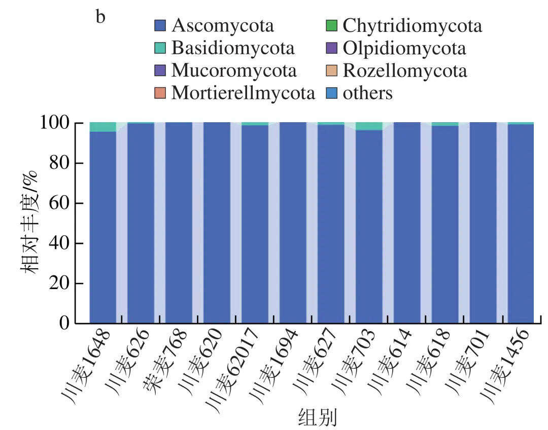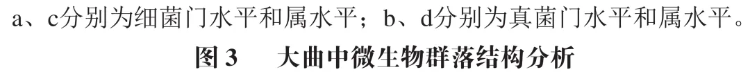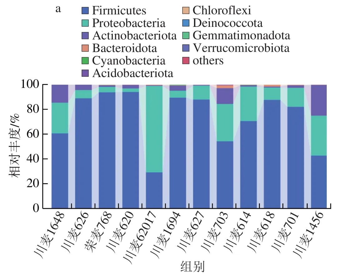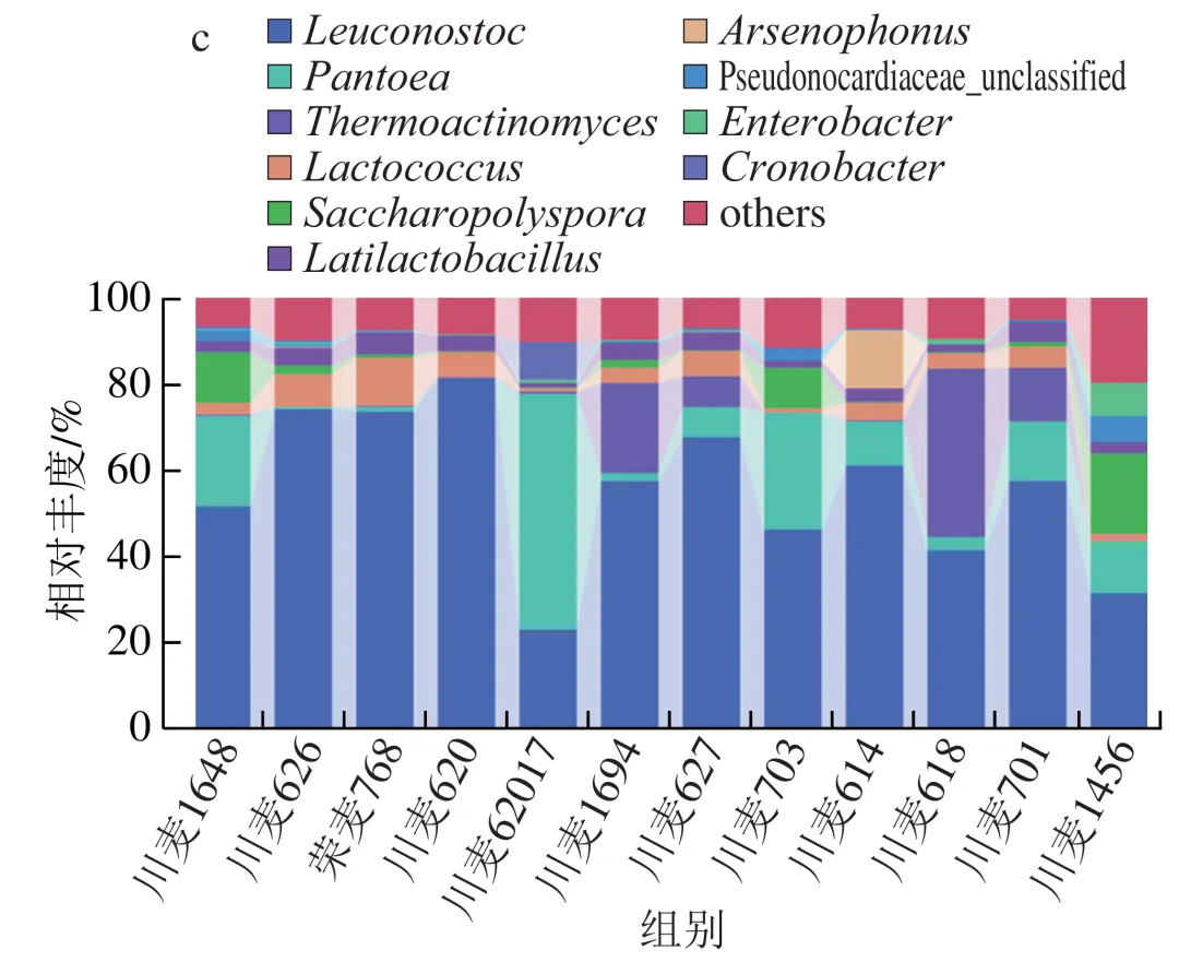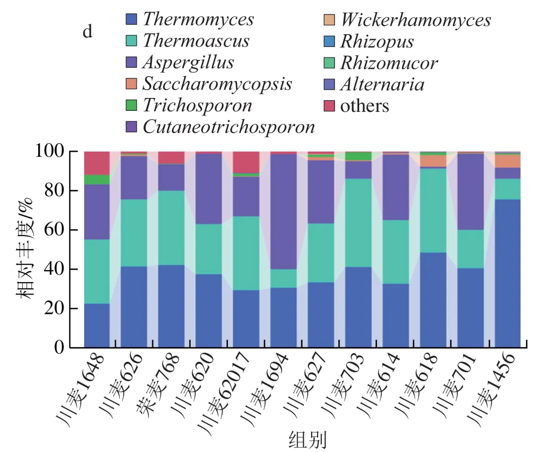 在细菌门水平上(图3a),厚壁菌门(Firmicutes,相对丰度29.19%~93.97%)、变形菌门(Proteobacteria,2.88%~69.78%)、放线菌门(Actinobacteriota,0.45%~24.80%)和拟杆菌门(Bacteroidota,0.02%~2.34%)是各品种小麦所制大曲中的优势细菌,但各样品间存在显著差异。例如,川麦62017中的优势细菌为变形菌门,而其他品种则为厚壁菌门。如图3c所示,在属水平上主要优势菌是明串珠菌属(Leuconostoc,相对丰度23.21%~81.07%)、泛菌属(Pantoea,0.23%~54.44%)、高温放线菌属(Thermoactinomyces,0.01%~39.07%)、乳球菌属(Lactococcus,0.77%~11.28%)和糖多孢菌属(Saccharopolyspora,0.18%~18.52%),这与毛文定等研究结果一致。在真菌门水平上,优势真菌为子囊菌门(Ascomycota),其相对丰度为95.21%~99.90%(图3b)。如图3d所示,在属水平上优势菌属为嗜热青霉属(Thermomyces)、嗜热子囊菌属(Thermoascus)、曲霉属(Aspergillus)、扣囊复膜孢酵母属(Saccharomycopsis)和毛孢子菌属(Trichosporon),这与刘孟华等的研究结果相似。