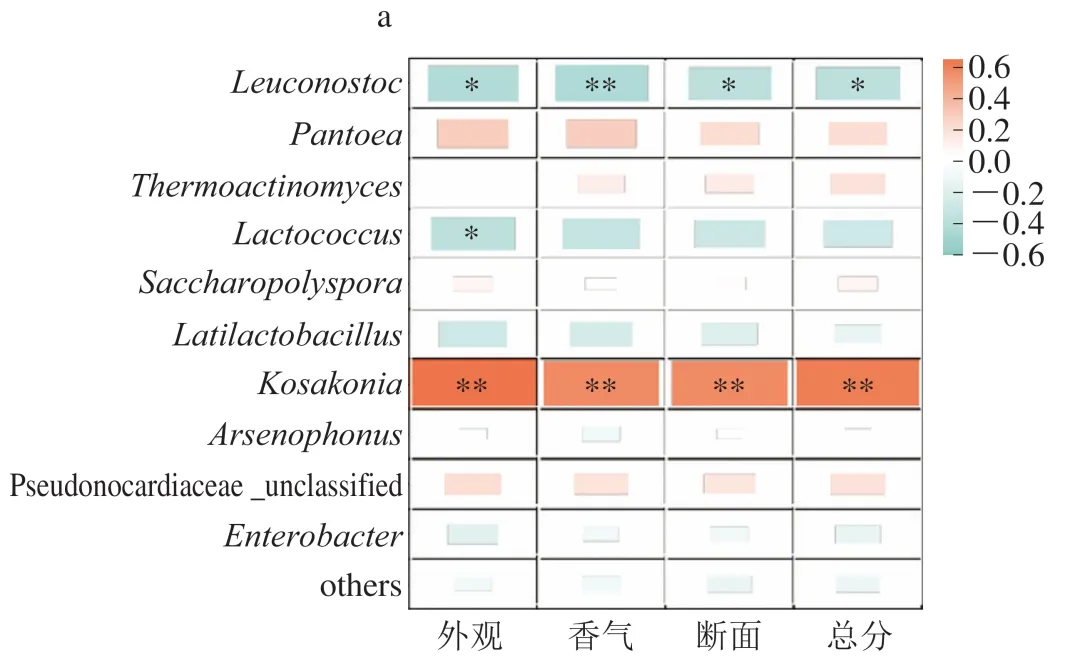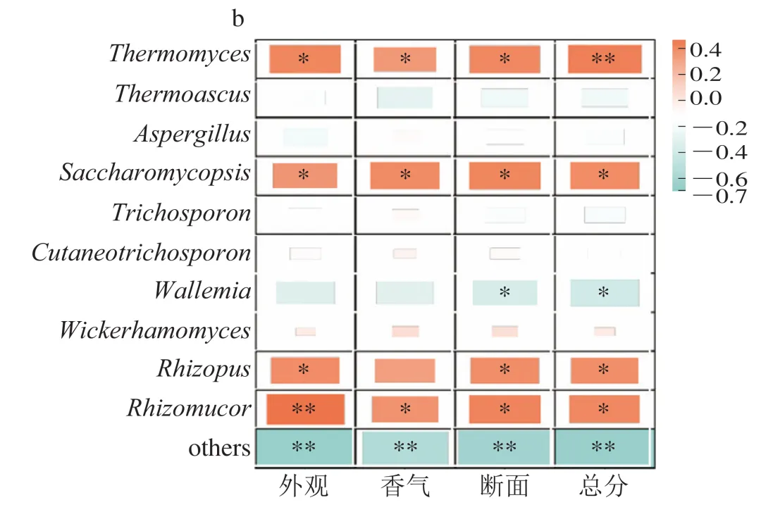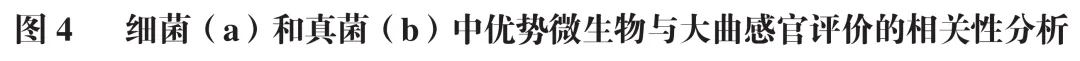 利用相关性分析进一步揭示优势微生物与感官评价得分之间的内在关联(图4)。在细菌方面,明串珠菌属与大曲的外观得分、断面得分及感官评价总分均呈显著负相关(P<0.05),与香气得分呈极显著负相关(P<0.01);乳球菌属则与外观得分呈显著负相关(P<0.05)。相反,科萨克氏菌属(Kosakonia)与所有感官评价得分均呈极显著正相关(P<0.01)。在真菌方面,嗜热青霉属(Thermomyces)与外观得分、香气得分及断面得分均呈显著正相关(P<0.05),与感官评价总分呈极显著正相关(P<0.01);扣囊复膜孢酵母与所有感官评价得分均呈显著正相关(P<0.05),根霉属(Rhizopus)与外观得分、断面得分及感官评价总分呈显著正相关(P<0.05),而瓦勒霉属(Wallemia)与断面得分及感官评价总分呈显著负相关(P<0.05)。根黏孢霉属(Rhizomucor)则与外观得分呈极显著正相关(P<0.01),并与香气得分、断面得分及感官评价总分均呈显著正相关(P<0.05)。其中,根霉属在大曲中的作用已经被广泛报道,万营东等以奇孢根霉(Rhizopus azygosporus)对浓香型大曲进行强化,可显著改善大曲的理化性质,降低淀粉含量,同时增强其风味。
