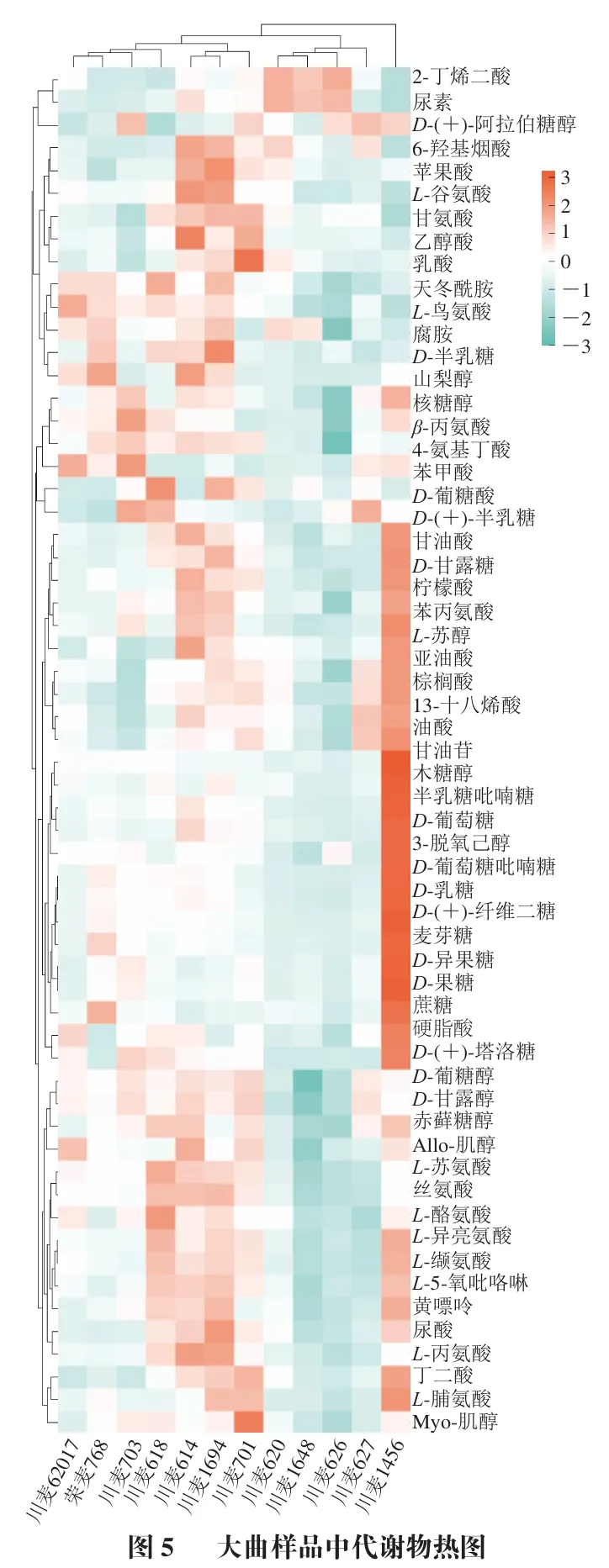 此外,一些籽粒品质指标也能够通过影响大曲微生物群落结构,进而对大曲质量产生影响。例如,粉碎度影响曲砖的质构特性,粉碎过细,曲砖过于紧密,不利于曲砖中需氧微生物生长。而湿面筋的主要成分是蛋白质,其水解后可以为微生物提供营养物质,同时其独特的网络结构可调节曲砖的透气性,从而影响大曲微生物群落结构,进而导致品质产生变化。采用GC-MS技术对12 个不同小麦品种制作的大曲样品进行代谢物分析,结果图5所示。从12 个不同小麦品种制作的大曲样品中共鉴定出60 种代谢物,按化学结构和生物学功能可分为9大类:碳水化合物(24 种)、氨基酸(15 种)、脂肪酸(7 种)、其他化合物(5 种)、羧酸(3 种)、α-羟基酸(2 种)、醇类(2 种)、β-羟基酸(1 种)和脂肪醇(1 种)。各类代谢物的平均相对含量存在显著差异,其中碳水化合物类(57.26%)和脂肪酸类(17.35%)占主导地位,而氨基酸类(12.18%)、有机酸类(8.47%)和醇类(3.85%)则相对较低。在所有鉴定的代谢物中,相对含量最高的代谢物依次为赤藓糖醇(78.14±18.53,平均峰面积,后同)、D-甘露糖(70.28±31.22)、核糖醇(52.26±12.42)、D-甘露醇(43.76±12.06)和D-(+)-阿拉伯糖醇(15.14±4.91)等,表明多元醇类和糖类物质构成了大曲代谢物谱的主体框架。不同小麦品种制作的大曲在代谢物组成和含量上存在显著差异,这种差异可能源于小麦品质特性对微生物群落的选择性影响。采用聚类分析和PLS-DA模型对各样品之间的差异化合物进行筛选,结果如图6所示。各小麦品种的大曲代谢物谱表现出明显的品种特异性,12 个样品被分为3 个主要类群:第1类包括川麦701、川麦768和川麦627,这些小麦品种均具有较低的硬度和蛋白质含量;第2类包括川麦618、川麦1456和川麦614,这些品种具有中等水平的品质特性;第3类包括川麦626、川麦1648等其余品种,主要特征是较高的硬度或蛋白质含量。