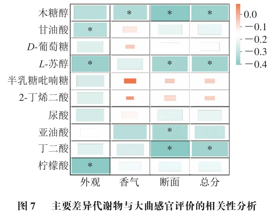 为0.83,表明模型具有良好的拟合性和预测能力。以变量投影重要性(VIP)>1.3和P<0.05为双重筛选标准,鉴定出15 种差异显著的代谢物,主要包括木糖醇、甘油酸、D-葡萄糖、L-苏醇、半乳糖吡喃糖、2-丁烯二酸、尿酸、亚油酸、丁二酸、柠檬酸、棕榈酸、13-十八烯酸、苹果酸、甘油苷和D-乳糖。这些代谢物可作为区分不同小麦品种所制大曲的潜在生物标志物。为揭示代谢物组成与大曲感官品质之间的关系,对筛选出的主要差异代谢物与感官评价指标进行Spearman相关性分析。如图7所示,多种代谢物与大曲感官品质存在显著相关性。木糖醇与香气得分、断面得分及感官评价总分均呈显著负相关(P<0.05)。木糖醇是戊糖代谢的中间产物,通常由大曲中的微生物如嗜热曲霉和扣囊复膜孢酵母通过戊糖磷酸途径产生。本研究中木糖醇与感官品质呈负相关,这可能归因于木糖醇积累反映了戊糖利用率低下,即微生物对戊糖类底物的代谢能力不足,导致中间产物积累而非转化为有益的风味前体物质。甘油酸、柠檬酸与外观得分呈显著负相关(P<0.05),亚油酸与断面得分呈显著负相关(P<0.05),丁二酸与断面得分及感官评价总分之间也呈显著负相关(P<0.05)。这些有机酸与大曲感官品质的负相关性可能源于它们对大曲pH值的影响。高浓度有机酸能降低大曲pH值,而适宜的酸碱环境是大曲中影响功能性微生物(如嗜热真菌)生长和酶促作用的关键条件。为深入探究大曲中代谢物之间的相互关系及其与微生物群落的联系,基于鉴定的60 种代谢物与10 种优势微生物进行了相关性网络分析。由图8可知,大曲代谢物与微生物之间存在显著而复杂的关联模式。Thermomyces与多种碳水化合物类代谢物呈显著正相关,包括D-果糖、D-异果糖和麦芽糖等。此外,Thermomyces与赤藓糖醇和木糖醇等多元醇类物质也呈正相关,表明该菌株在大曲中发挥重要的碳水化合物代谢功能。Thermoascus则主要与有机酸类代谢物呈显著负相关,如苹果酸(r=-0.412,P<0.05)和棕榈酸(r=-0.495,P<0.01)。这种相关模式差异表明,尽管这2 种嗜热真菌在大曲高温阶段同时生长,但它们可能在碳代谢网络中占据不同生态位,协同影响大曲风味形成。Saccharomycopsis与数种糖醇类化合物呈显著正相关,如赤藓糖醇、D-(+)-半乳糖和D-(+)-塔洛糖,这是因为该酵母具有较强分泌糖化酶的能力。有趣的是,Leuconostoc与多种代谢物呈显著负相关,特别是与L-异亮氨酸、L-酪氨酸、甘油苷和D-(+)-塔洛糖等物质。这种广泛的负相关性支持了前人研究中明串珠菌属与大曲感官品质呈负相关的观察结果,进一步说明该菌群可能通过干扰正常代谢网络而影响大曲品质。本研究对12 种不同小麦品种的品质性状、制曲品质、大曲中微生物群落结构及代谢物进行了系统分析,结果表明低籽粒硬度、蛋白质含量、湿面筋含量的小麦品种更适宜于生产优质大曲。微生物分析结果表明,相较于细菌,真菌对大曲品质可能具有更大的贡献。此外,木糖醇、甘油酸、L-苏醇、亚油酸、丁二酸和柠檬酸对大曲的品质具有潜在的关联性,同时这些化合物也是区分不同品种小麦所制大曲的潜在生物标志物。综上所述,本研究综合小麦品质特性、微生物群落和代谢物分析结果,提出一个“小麦品质-微生物群落-代谢产物-大曲品质”的关联模型。在此模型中,低硬度、低蛋白质含量的小麦品种首先通过影响物理结构和营养环境选择性促进嗜热青霉属等功能性真菌的生长,抑制明串珠菌属等不利微生物的繁殖;随后,这些功能性真菌通过特定的代谢途径产生多元醇类、糖类等有益代谢物,同时减少有机酸等不利代谢物的积累,最终形成品质优良的大曲。研究结果可为制曲专用小麦新品种选育和优质大曲发酵提供理论参考。本文《小麦品种对浓香型大曲品质、微生物群落及代谢产物的影响》来源于《食品科学》2025年46卷第20期133-141页,作者:罗江陶,赵驰,汤奥星,张凤菊,杜禹锋,李治华,蒲宗君*。DOI:10.7506/spkx1002-6630-20250417-138。点击下方阅读原文即可查看文章相关信息。实习编辑:普怡然 ;责任编辑:张睿梅。点击下方阅读原文即可查看全文。图片来源于文章原文及摄图网。