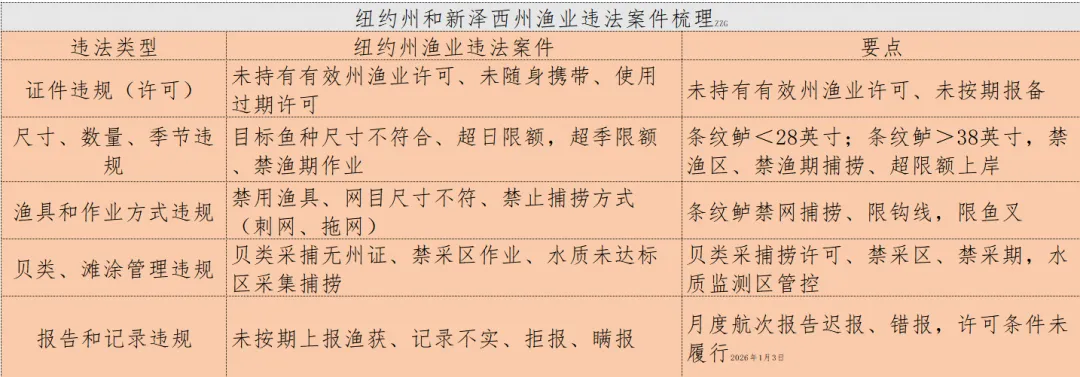 等;处罚包括罚款、州许可暂停 / 吊销、禁渔期、没收渔获 / 渔具等。