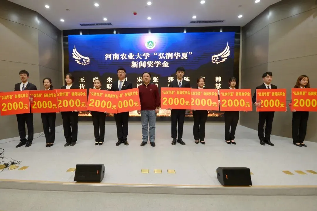 12月16日晚,校党委宣传部举办2019-2020年度优秀学生记者表彰大会暨河南农业大学融媒论坛专题培训,隆重表彰优秀学生记者并颁发首届“弘润华夏”新闻奖学金,同时开展专业培训。河南弘润华夏实业集团有限公司董事长宋智辉、校党委宣传部全体成员、大学生记者团成员、校学生会、微晓农大工作室以及校十佳社团代表近300人参加会议。此次表彰大会同时进行了现场视频直播,近5000人通过网络观看直播。