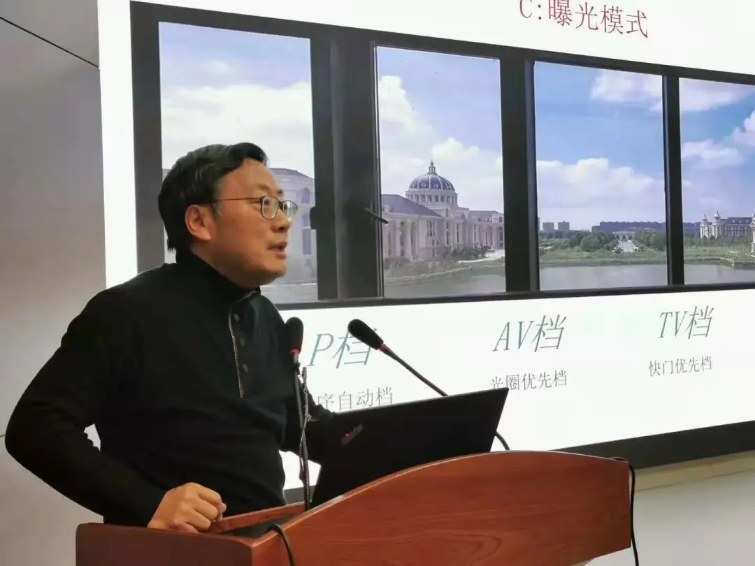 表彰结束后,崔俞老师从物质层面和非物质层面两方面入手,对大学生记者进行专业摄影培训,他由浅入深、由易入难地讲解了摄影构图方法与技巧、画面视觉的抓取、拍摄过程中应注意的要点等内容。