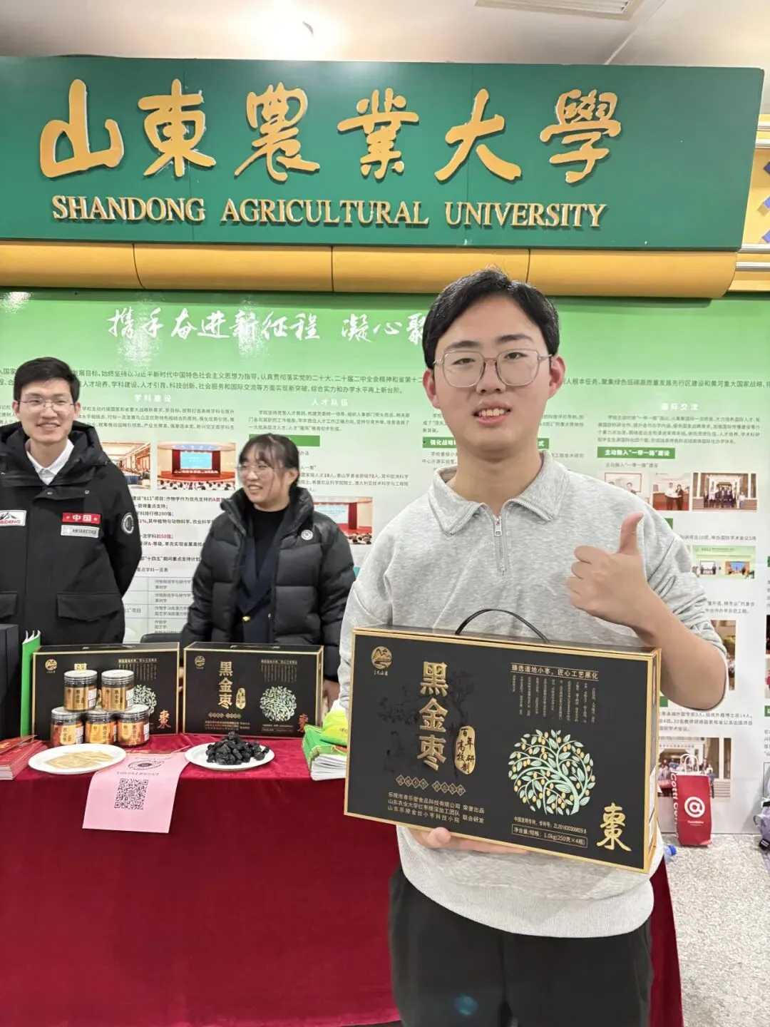 晚会现场设置的产品展示区吸引师生驻足。团队秉持“产学研融合”理念,依托该校科研资源,深耕乐陵金丝小枣产业,挖掘其营养与产业价值,助力地方特色农业升级。