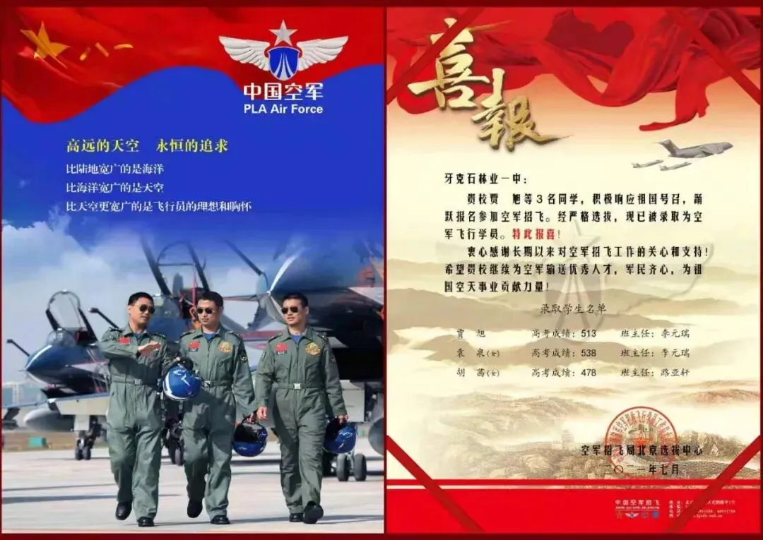 据了解,中国人民解放军空军航空大学飞行技术专业今年在内蒙古自治区共录取38名空军飞行学员,其中33名男生、5名女生,男生连续3年超计划完成任务,女生录取人数全国第一;牙克石林业一中录取三名,其中两名女飞行学员,成为全国录取女生人数最多的高中学校,高三13班毕业生袁泉以538分的成绩位列自治区首位。