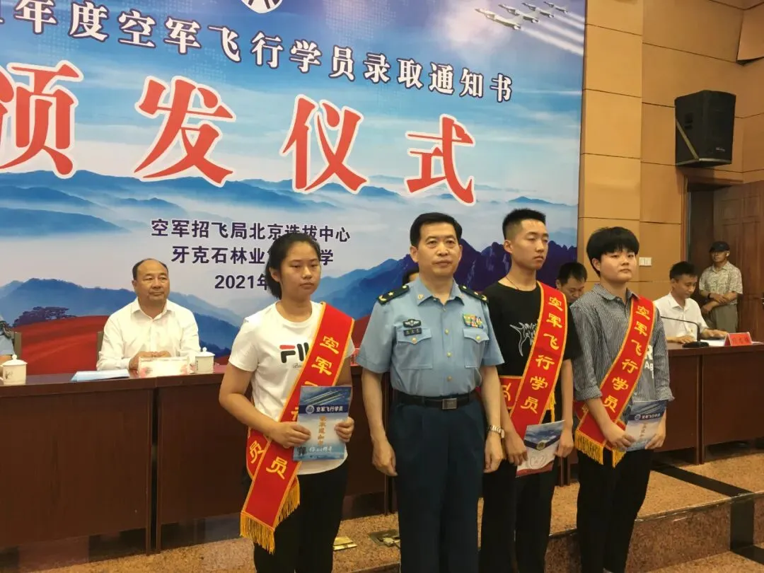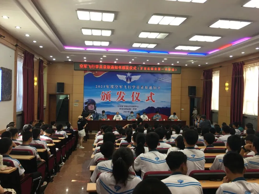 7月16日上午,牙克石林业第一中学举办空军飞行学员录取通知书颁发仪式,为三名学生颁发录取通知书。中部战区空军政治工作部副主任张方军、呼伦贝尔市政府副市长吕贵和等参加仪式。空军招飞局北京选拔中心向牙克石林业第一中学发来贺电,祝贺学校2021届三名毕业生实现凌云壮志,成为光荣的人民空军,成为战斗英雄王海、航天英雄杨利伟、女航天员刘洋的学弟学妹。