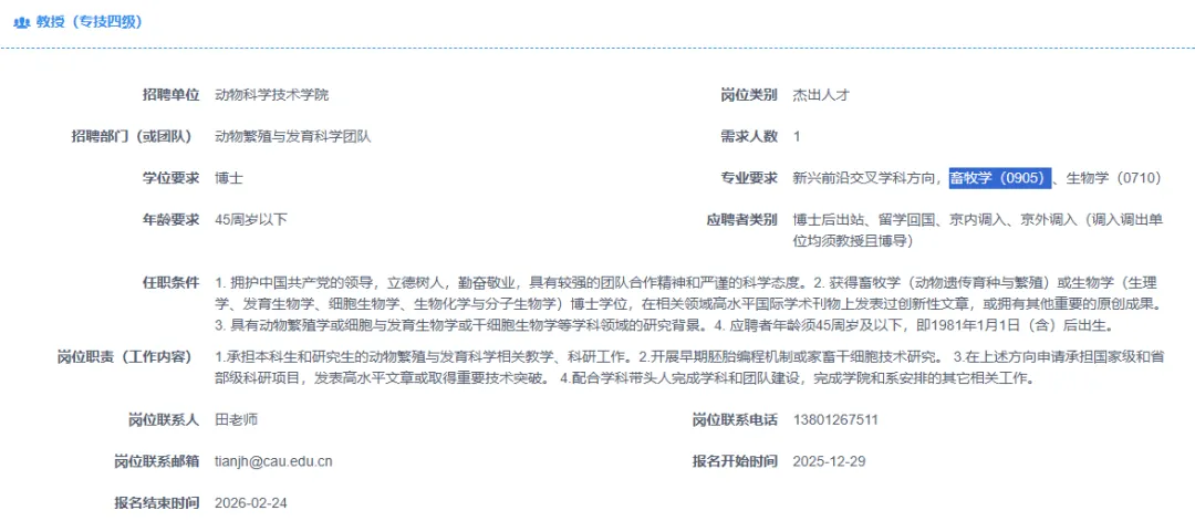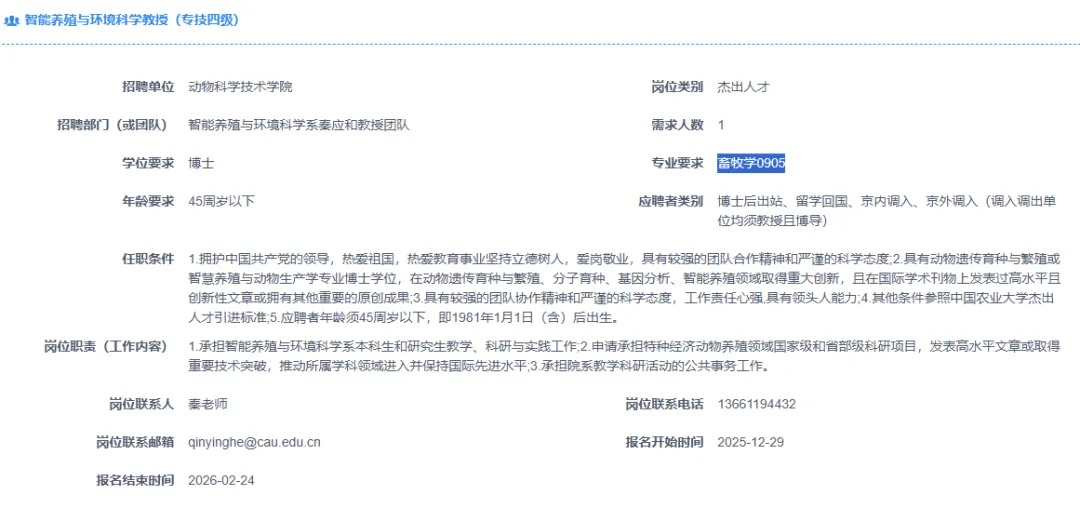 【北京】中国农业大学招聘多名兽医、畜牧博士及博士后