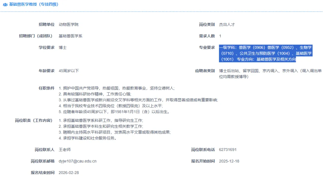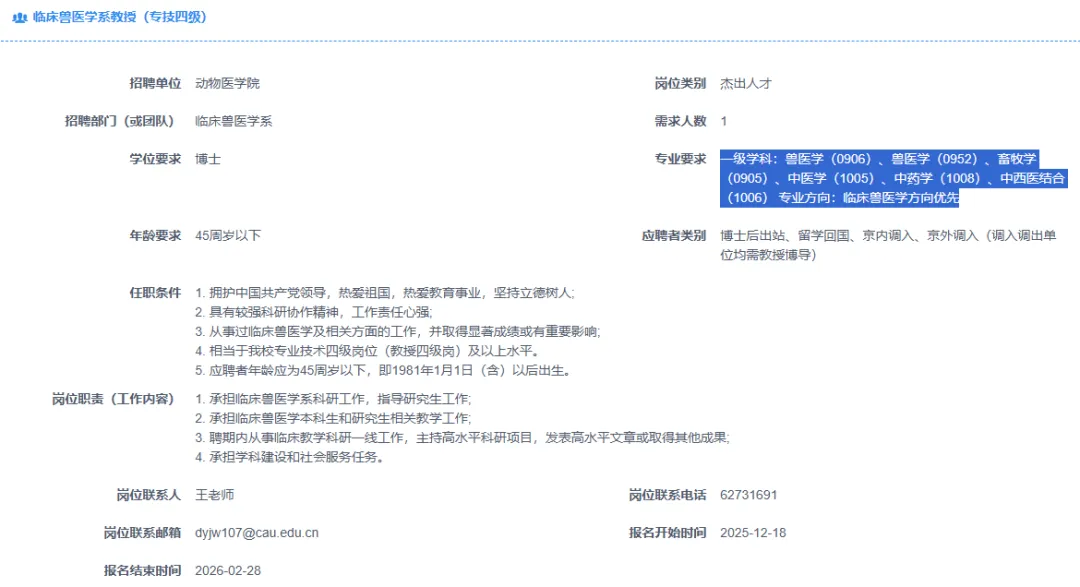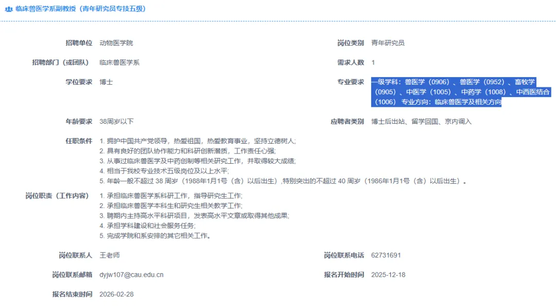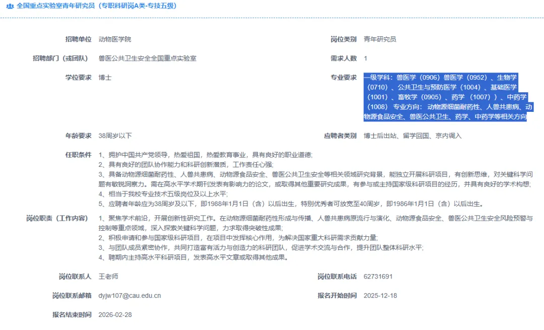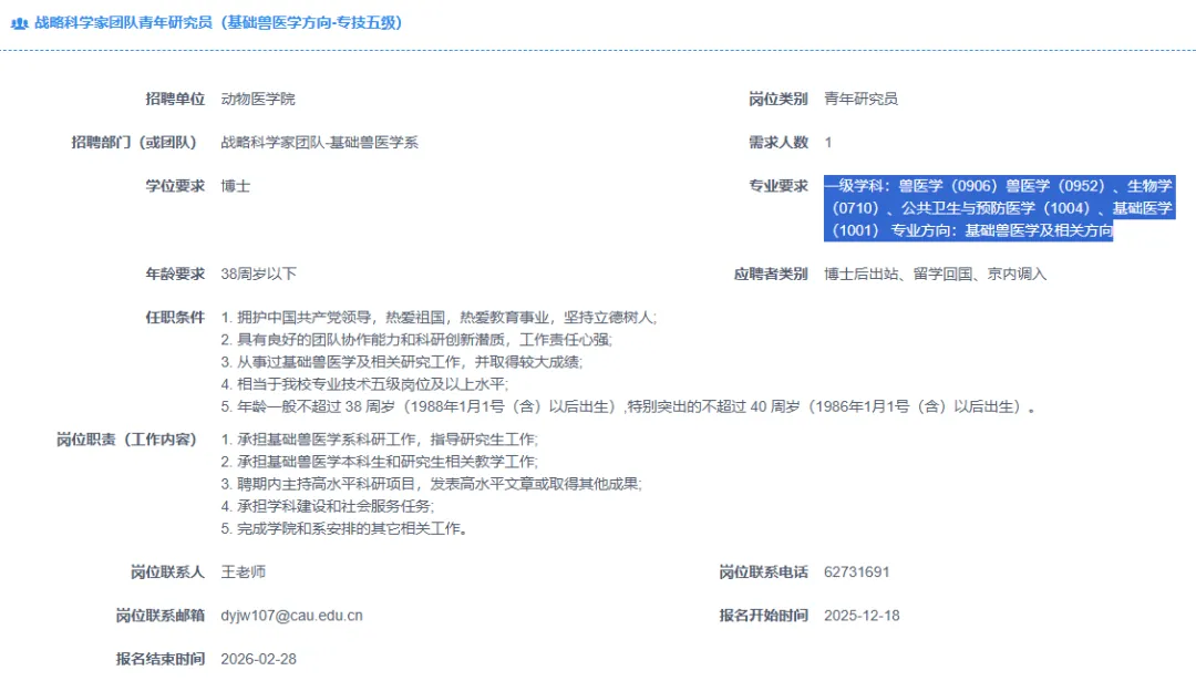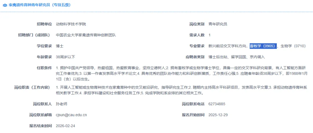 >【北京】中国农业大学招聘多名兽医、畜牧博士及博士后