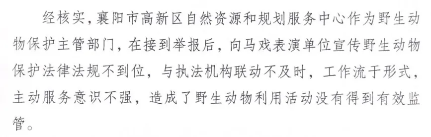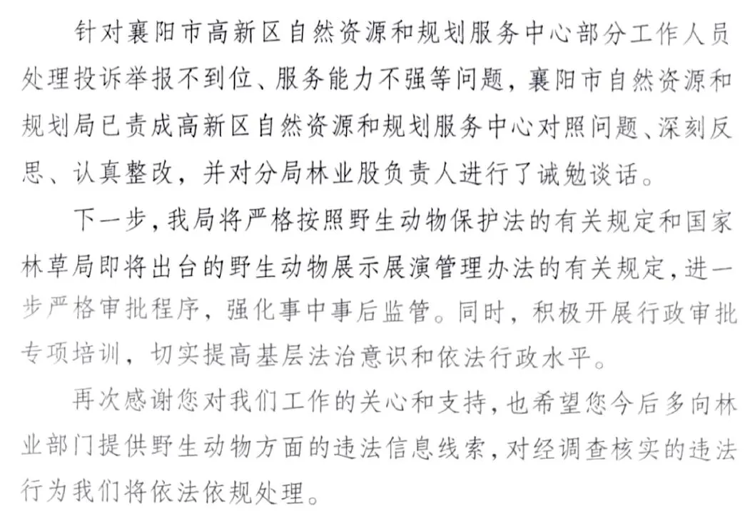 是的,省林业局始终不认可我们提供的图像资料,不认定该游乐园违法利用野生动物表演的行为。对有关人员进行了“诚勉谈话”,不是因为核心的“怠于职责,未对违法行为作出依法处理”,而是“服务问题”——“主动服务意识不强”、“服务能力不强”。