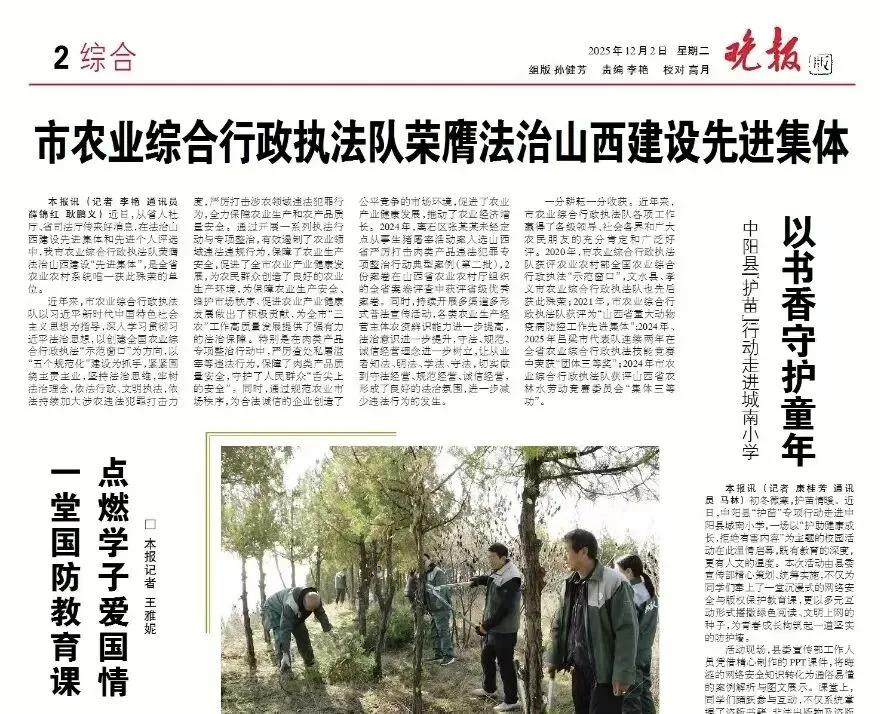 严格落实“谁执法,谁普法”要求,紧紧抓住普法宣传教育宣传资料“全”、普法行动“早”、宣传形式“多”三字经,创新开展普法宣传教育工作,并同步将各类生产经营采购销售台账无偿送到农资生产经营户手里,普法宣传质效显著提升,农民群众真假农资辨识能力进一步提高,生产经营单位生产经营行为进一步规范。2025年11月,市农业综合行政执法队被省人社厅、司法厅评为“法治山西建设先进单位”。