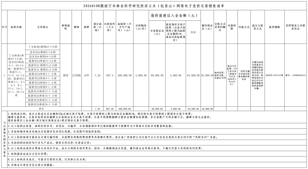20260108(周四)南宁市林业科学研究所活立木(包青山)交易项目销售标的如下: