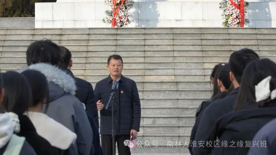 黄学明书记在讲话中深情回顾了刘老庄八十二烈士为掩护群众安全转移而浴血奋战、壮烈牺牲的英雄事迹。他指出,英烈精神犹如一座永不熄灭的灯塔,始终照亮我们奋进前行的道路,并对在场“缘之缘·复兴班”同学提出三点期望:一要深植信仰之种,筑牢思想根基,从红色历史中汲取精神滋养;二要锤炼过硬品格,做到自律自强,在知行合一中提升能力素养;三要勇担时代重任,发挥模范作用,将个人奋斗融入国家发展大局。